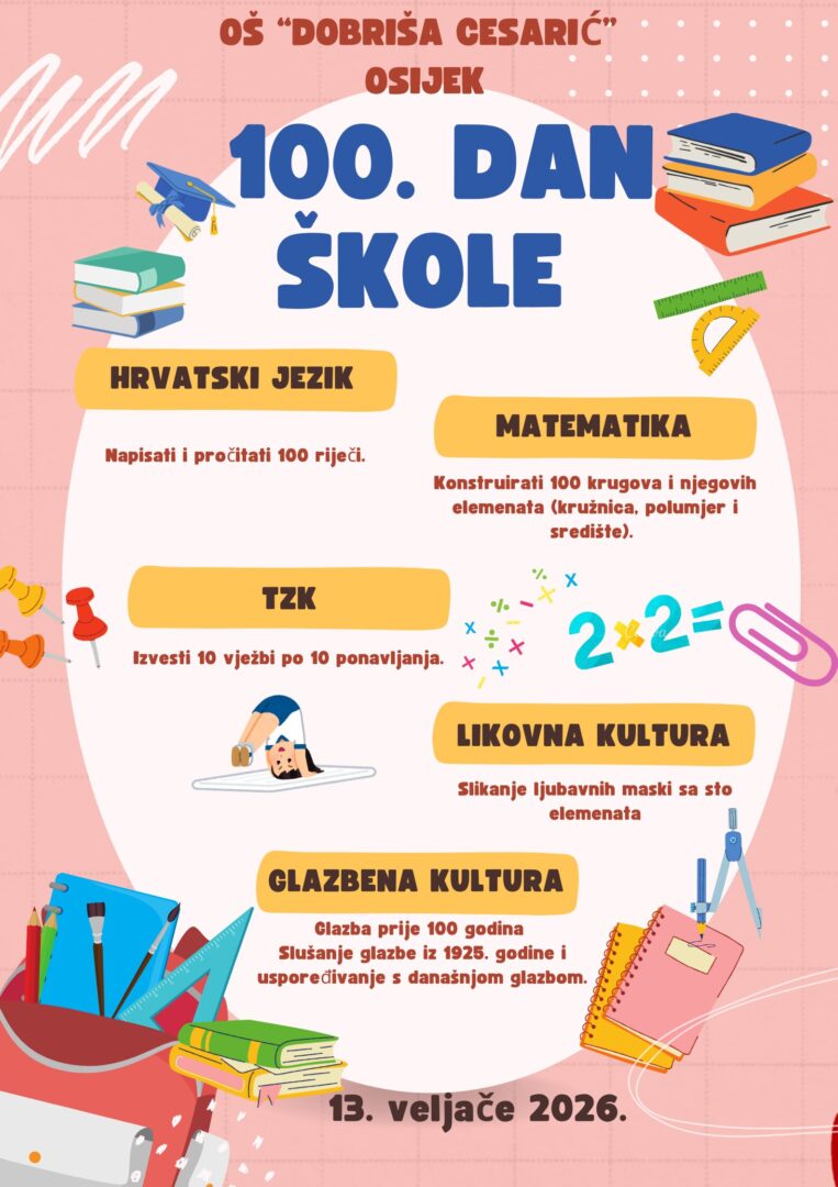 Učiteljice razredne nastave sa svojim su učenicima na nastavi i u produženom boravku obilježile 100. dan škole, poseban dan koji potiče kreativnost, suradnju i radost učenja. Kroz niz zanimljivih zadataka učenici su istraživali broj 100 na maštovit i razigran način.
