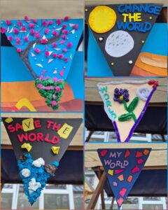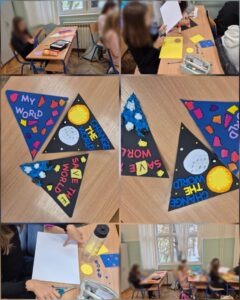 Kako se u školi održavao božićni sajam, kreativnost učenica došla je do punog izražaja. Ručno su izradile šarene zastave s različitim motivima i porukama, a sa zastavama smo ukrasili jedan od štandova na sajmu.