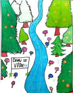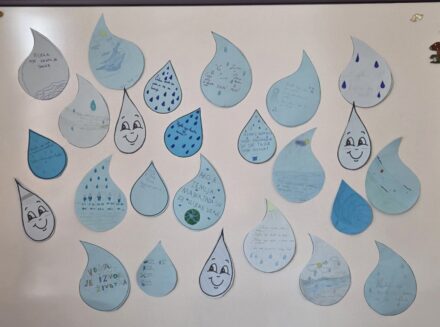 Na satu Prirode učenici 5.b razreda, na zabavan način povezali znanje o kruženju vode u prirodi s vlastitom kreativnošću. Svaki je učenik dobio papir u obliku kapljice koji je postao mali ekološki podsjetnik. S jedne strane, učenici su crtežom prikazali putovanje vode – od plavog mora do kišnih oblaka. S druge strane, ispisali su snažne poruke o očuvanju vode, obećavši da će kao pojedinci štedjeti svaku kap, zatvarati slavine i čuvati naše rijeke čistima. Ovim radovima pokazali su da i mala kapljica, baš kao i svaki učenik, može pokrenuti veliku promjenu za naš planet.