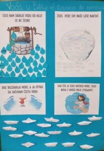 Povodom Svjetskog dana voda, na nastavi vjeronauka u 5.b razredu proveli smo projekt čiji je cilj bio istražiti duboko simboličko značenje vode u Bibliji i kršćanskom životu. Kroz četiri biblijska teksta — od susreta sa Samaritankom do smirivanja oluje — učenici su povezali biblijske poruke s osobnim duhovnim rastom i ekološkom odgovornošću. Kreativnim aktivnostima, poput izrade origami brodića i pisanja poruka na papirnate kapi, djeca su osvijestila važnost „vode žive“, snagu krštenja te nužnost čuvanja prirode kao Božjeg dara. Projekt je uspješno povezao vjeronaučne sadržaje sa svakodnevnim životom, potičući učenike na promišljanje o vlastitim strahovima, navikama i brizi za zajednički dom.